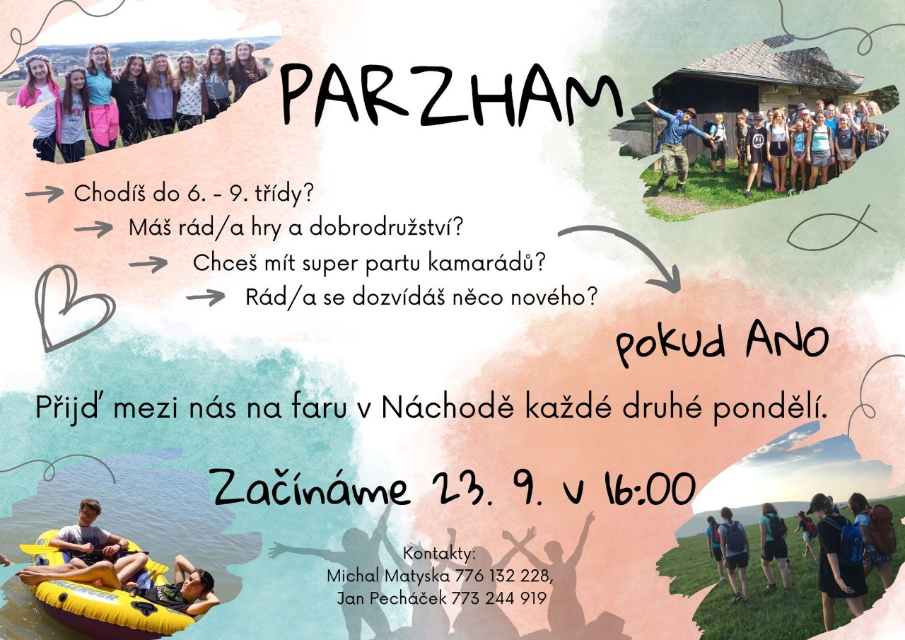 Parzham je společenství mladší mládeže. Scházíme se v pondělí 1x za 14 dní na faře v Náchodě a jsme otevření lidem z širého okolí - jezdí k nám kluci a holky třebas i z Kostelce. Do roka máme i několik víkendovek.