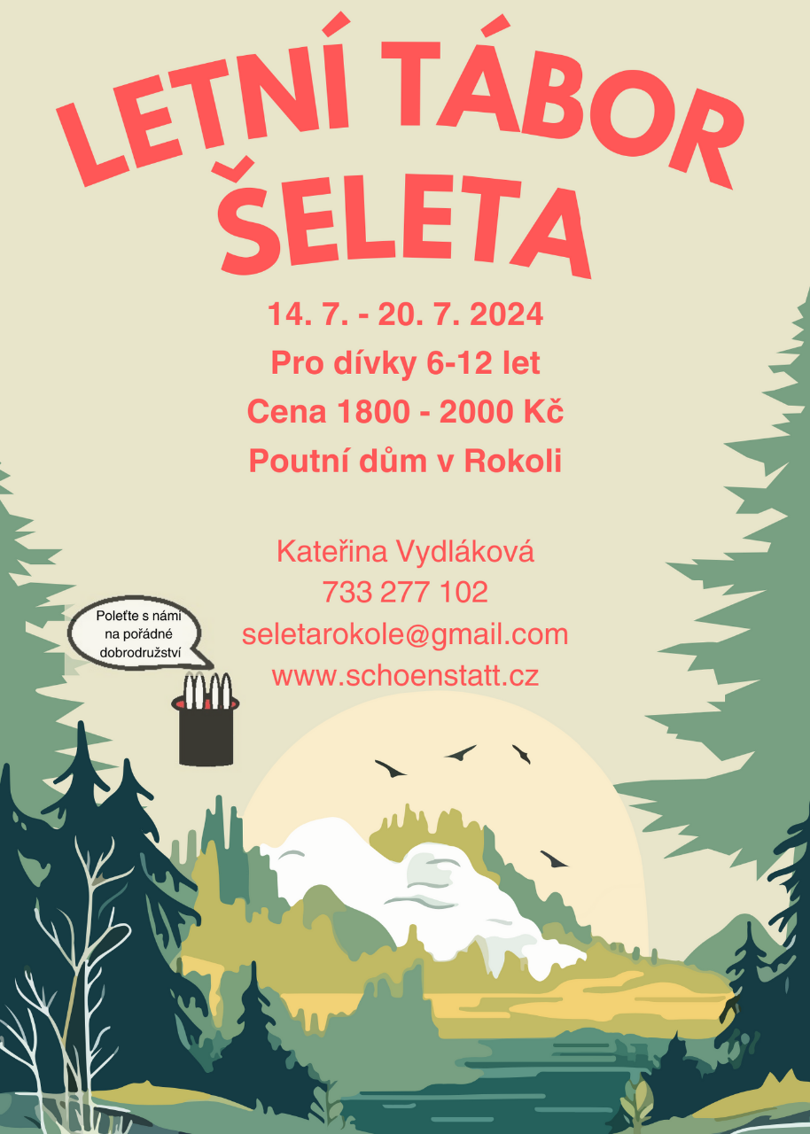 máme tu další ročník Šelety, letního tábora pro dívky ve věku 6-12 let. ŠEnštatský LEtní TÁbor je pořádán dívčí mládeží pod záštitou Schönstattských Mariiných sester a holky se mohou těšit na spoustu her, krásnou přírodu, nová přátelství a na programy s duchovním přesahem.